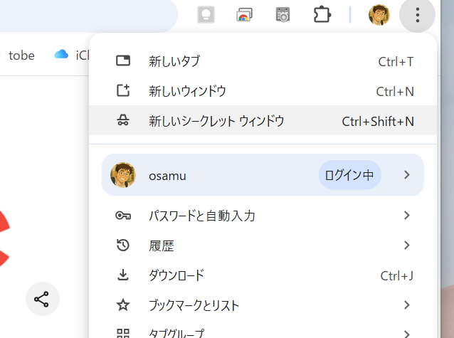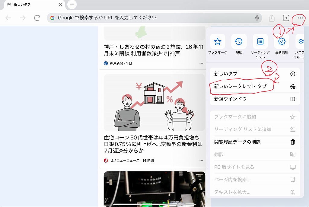 ● googleCromeの右上の三点バーを押して新しいシークレットタブを出す。
